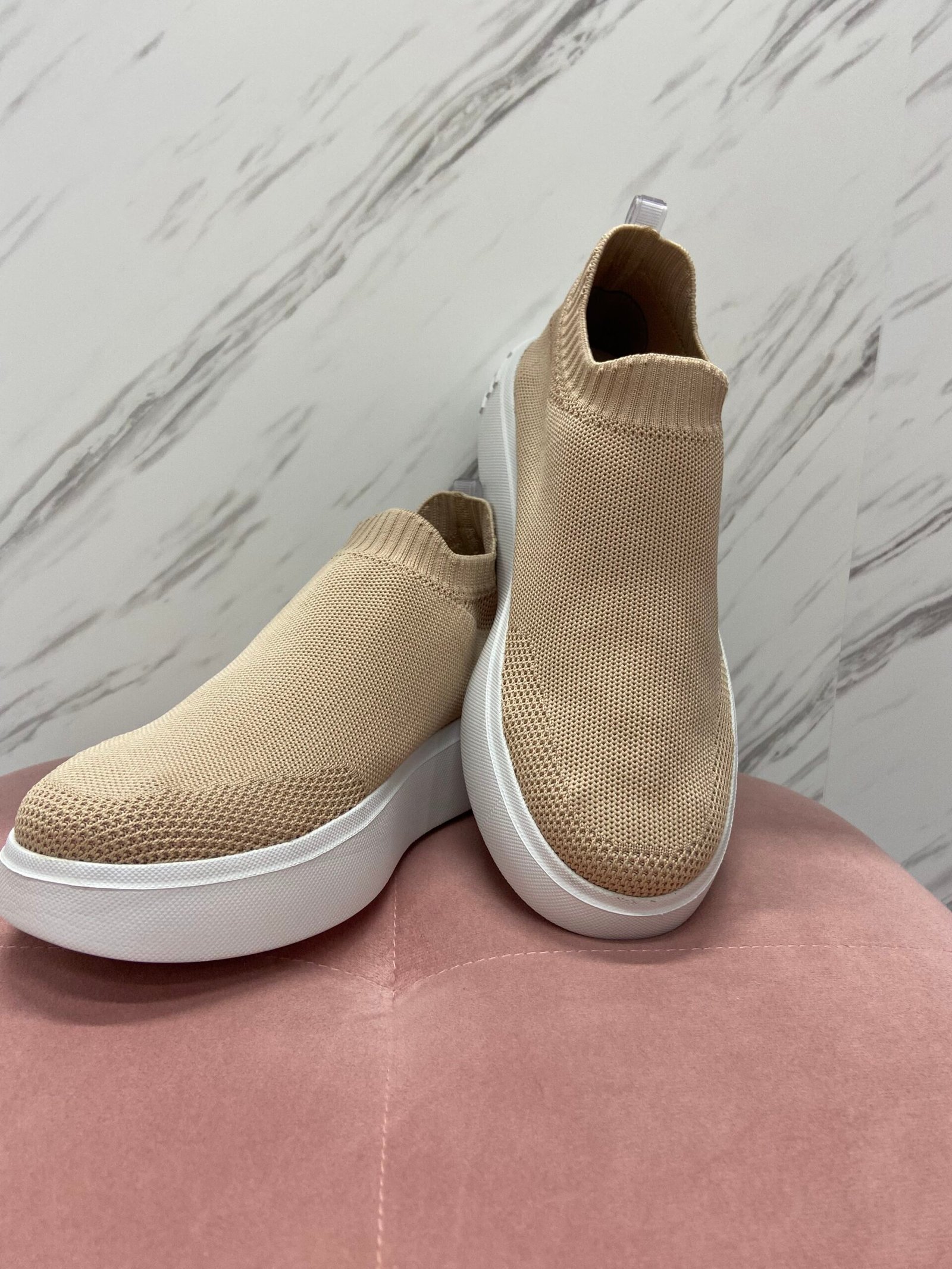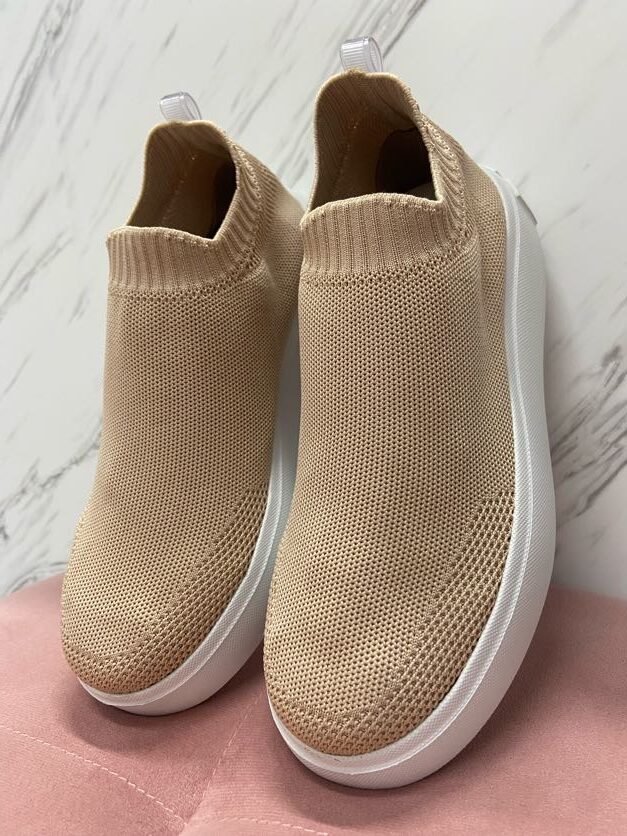 Tênis nude new de knit. Possui solado flatform branco em J-Lastic, nome da marca na traseira da sola e fita de gorgorão da mesma cor no calcanhar.